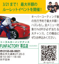 今回のイベントは、キーパーコーティング春の先行予約!ルーレットは「ハズレなし」で必ずコーティングに関する何かが当たるお得な内容となっています。詳しくは「月刊しゅん」2月号に掲載しているので、電子版やご自宅配布用をご確認ください。当店にも置いていますので、ご来店お待ちしております。