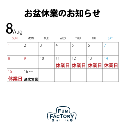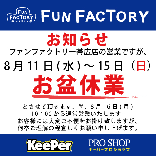 ファンファクトリー帯広店の営業ですが「お盆休業」のため、8月11日(水)から15日(日)まで、誠に勝手ではございますが、お休みとさせていただきます。
