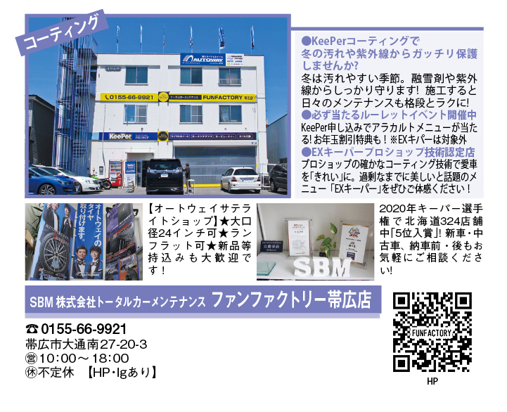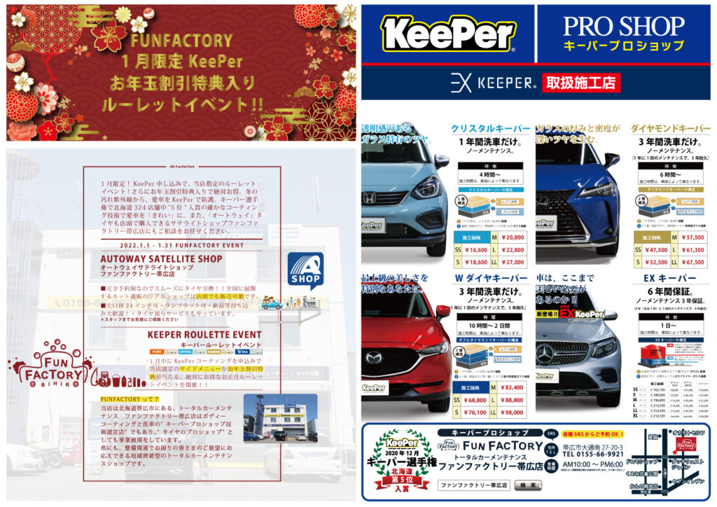 EXキーパープロショップでファンファクトリー帯広店のコーティング技術をぜひご体感ください!もちろん車両整備等もお気軽にご相談ください。