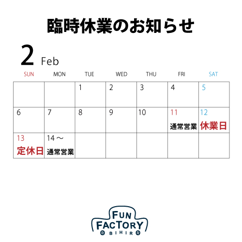 2月12日(土)を、誠に勝手ではございますが、臨時休業とさせていただきます。