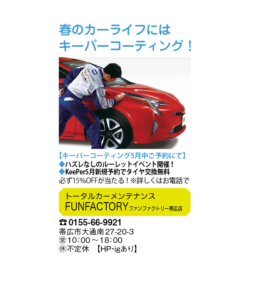 十勝の生活情報雑誌「月刊しゅん」5月号にファンファクトリー帯広店のコーティングイベントが62ページに掲載されています。