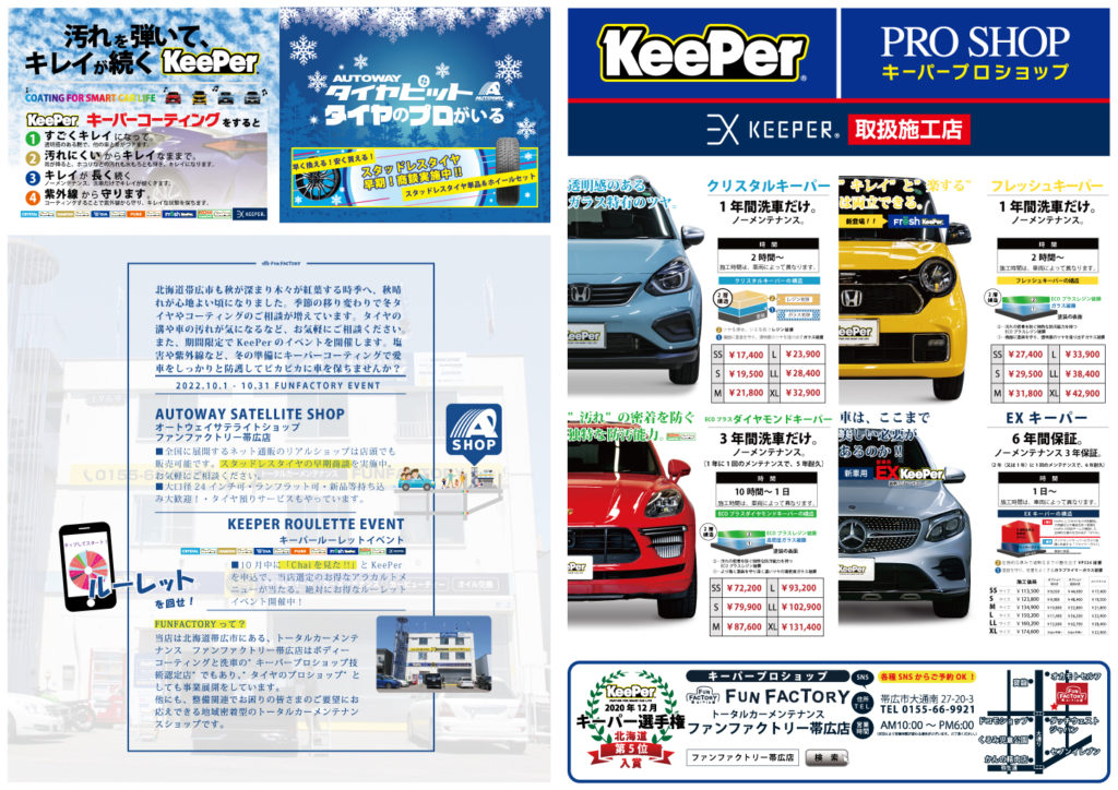 EXキーパープロショップでファンファクトリー帯広店のコーティング技術をぜひご体感ください!もちろん車両整備等もお気軽にご相談ください。