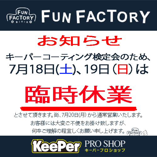 ファンファクトリー帯広店の営業ですが「キーパーコーティング検定会」のため、7月18日(土)、19日(日)を、誠に勝手ではございますが、臨時休業とさせていただきます。