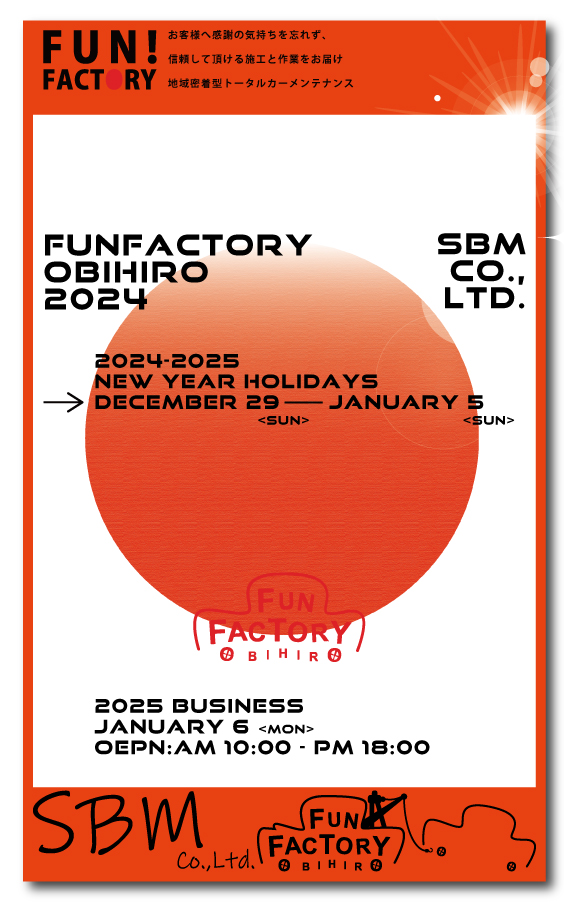 まだまだ足りない事がたくさんあり、創造するには人と人の協力や支え合いが必要とする中で、来年も新しい挑戦に取り組んでいける事を切に願い、FUNFACTORYの業務を通じて地域密着型のトータルカーメンテナンスショップとしてサービスを提供させて頂ければと思います。