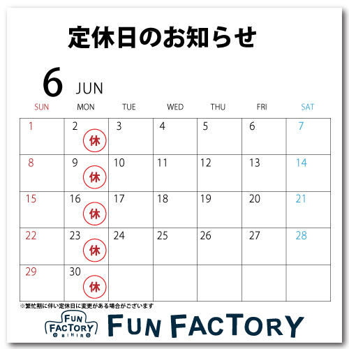ファンファクトリー帯広店の営業ですが、下記の日程で定休日とさせていただきます。