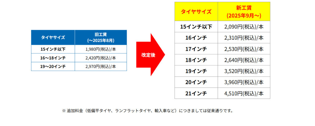 2025年9月1日以降にタイヤ交換をされるお客様は新工賃となります。