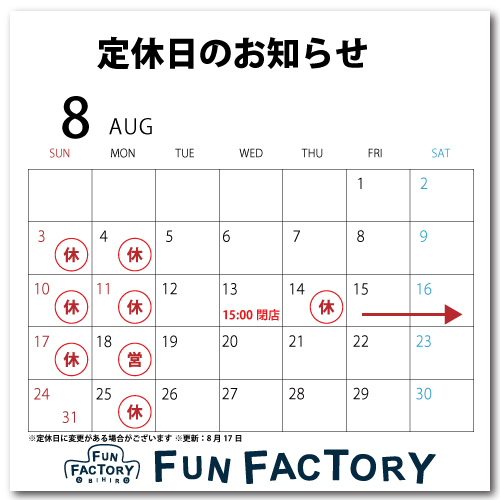 ファンファクトリー帯広店の営業ですが、下記の日程でお盆休業と定休日(更新)とさせていただきます。