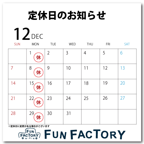 ファンファクトリー帯広店の営業ですが、下記の日程で定休日とさせていただきます。