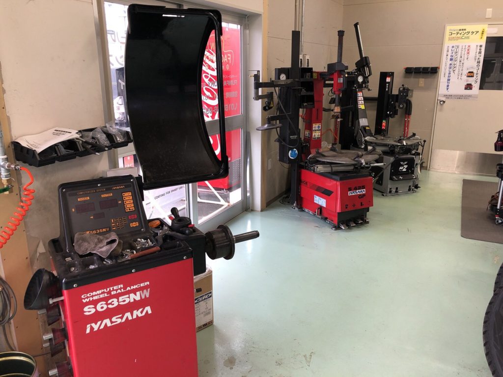 タイヤ交換を行うブースには様々な器具があります。専任スタッフがタイヤの組替から、バランス調整をし、脱着まで丁寧な作業を心がけています。