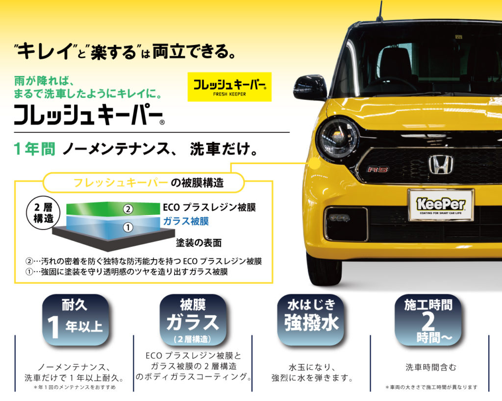 ・ノーメンテナンス、洗車だけで1年以上耐久。ガラス被膜とECOプラスレジン被膜で”キレイ”と”楽する”を両立するボディガラスコーティング「フレッシュキーパー」