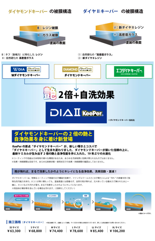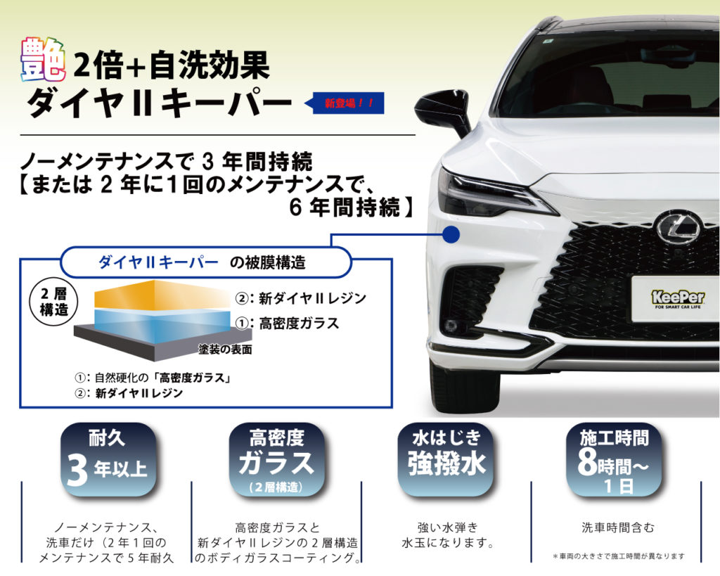 ・3年間ノーメンテナンスと1年1回のメンテナンスで、5年耐久が選べて、洗車だけ。最上級の美しさで高密度2層ガラス被膜のボディガラスコーティング「Wダイヤモンドキーパー」