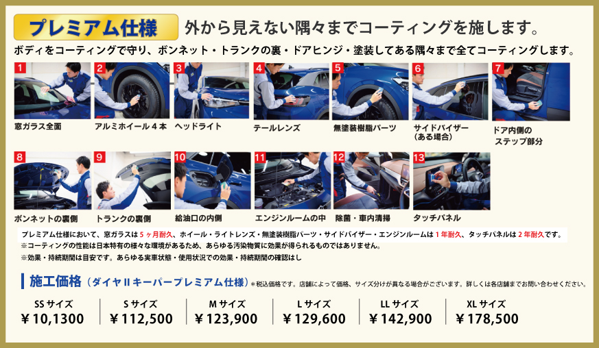 ・3年間ノーメンテナンスと1年1回のメンテナンスで5年耐久を選べる、高密度のボディガラスコーティング「ダイヤモンドキーパー」