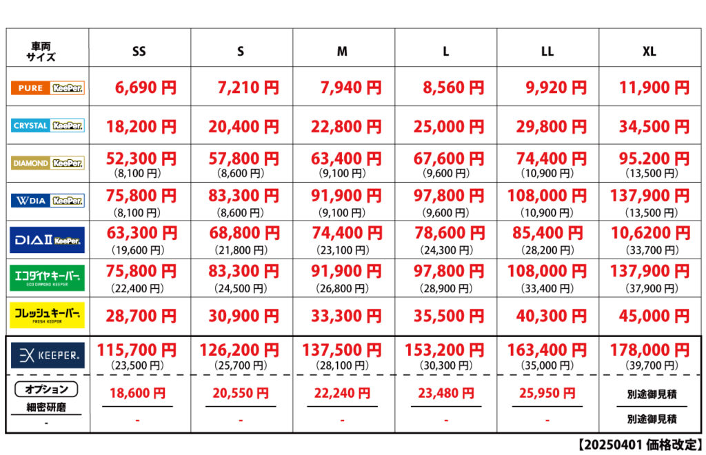 ・”新車用”EXキーパーはダイヤモンドに匹敵するガラス被膜「プライマーガラス」。その上に圧倒的な厚みを生み出す「VP326」で驚くほど強撥水でホコリや汚れ、水シミ、水垢を寄せ付けない。新開発の「EXキーパー」(EXキーパーは6年保証です。2年に1回のメンテナンスが必要です。ノーメンテナンスなら3年保証)