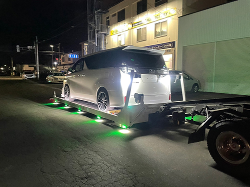 自社所有の積載車で輸入車や国産車ワイドロングのワンボックスをはじめ、低床・幅広のカスタムカーなどフルフラットで対応し楽々積めます。
