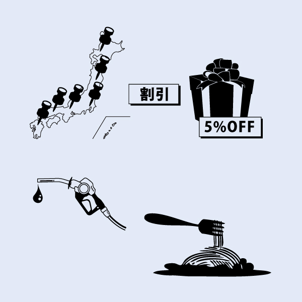 JAF会員証提示やクーポン利用で、ガソリンスタンド、飲食店、ショッピングなど様々なジャンルの優待施設がお得に利用できます。