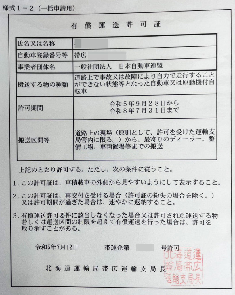 北海道運輸局帯広運輸支局に届け出を出しておりますので安心してご依頼ください。