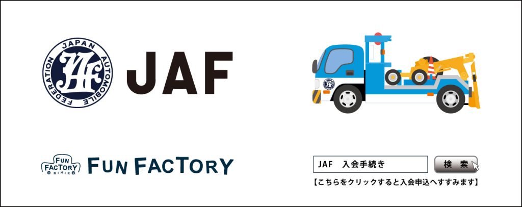 JAFに入会し登録すると、様々な”JAFサービス”や”会員優待サービス”を受けることができます。この機会にぜひご登録してみてはいかがでしょうか。FUNFACTORY JAFページをご覧頂きありがとうございます。