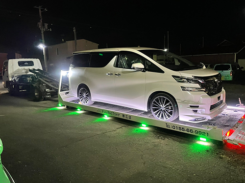 自社所有の積載車で輸入車や国産車ワイドロングのワンボックスをはじめ、低床・幅広のカスタムカーなどフルフラットで対応し楽々積めます。