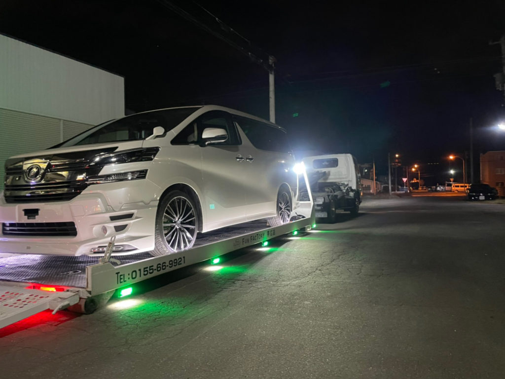 SBMの搬送車は、フルフラットで対応するのでエアサスの壊れてしまって車高の低くなってしまった車にも低床にして対応しています。
